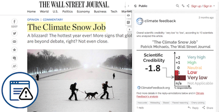 Climate Feedback organizes a worldwide network of scientists to assess the credibility of influential climate change information. When a climate story is trending on social networks, we typically invite half a dozen scientists with expertise on the subject to collaboratively comment on the articles’ main claims. Scientists also provide an overall rating of the article’s scientific credibility based on its factual accuracy, logic, objectivity, and quality of sources used.