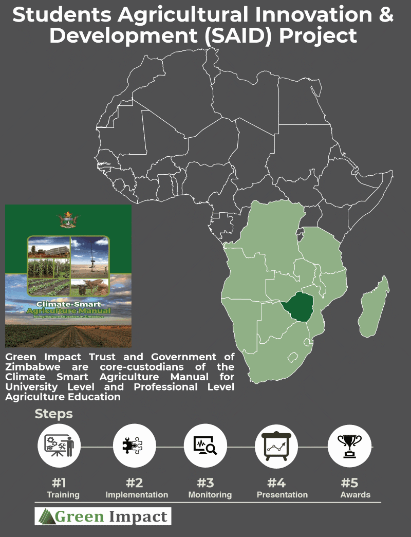 The projects directly address challenges being faced in research, education, extension and industry sub-sectors in Zimbabwe’s agricultural economy. In November 2015, the Government of Zimbabwe submitted a request for technical assistance to the United Nations Framework Convention on Climate Change (UNFCCC) Climate Technology Centre and Network (CTCN), on behalf of the Green Impact Trust, to develop a Climate Smart Agriculture (CSA) Manual for University-level and professional-level agricultural education in Zimbabwe. The purpose of the CSA Manual is to increase capacity on climate resilience in colleges of agriculture, universities, extensions, professionals and the farming community of Zimbabwe.